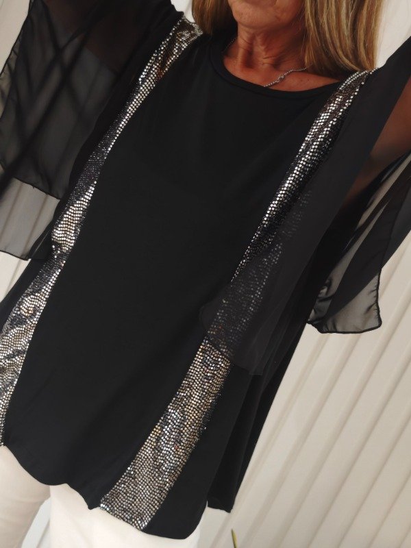 Blusa Daiana de creppe con manga gasa y detalle lentejuelas brillo. Molderia amplia
