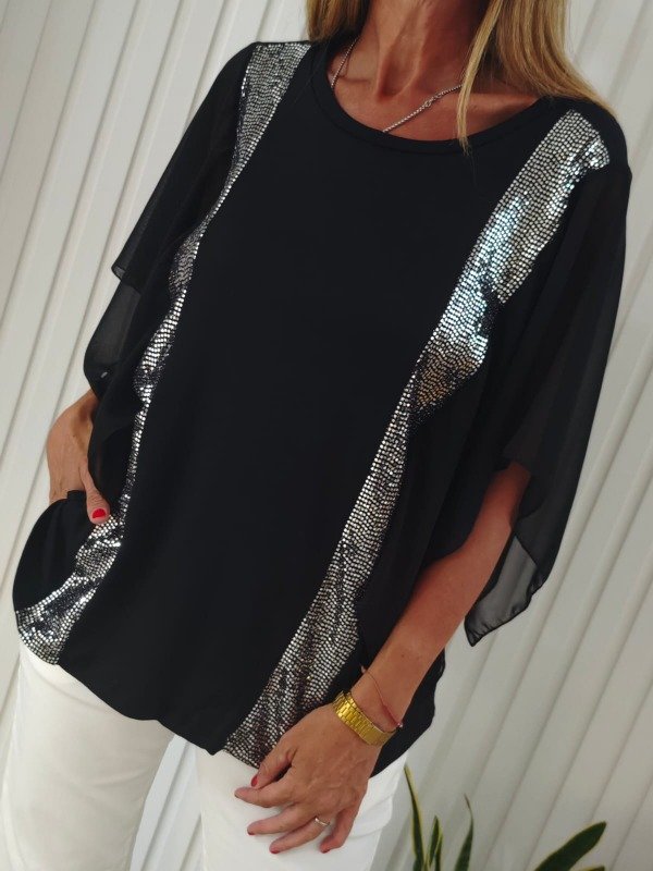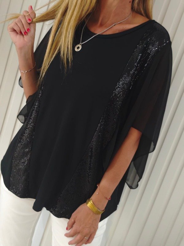 Blusa Daiana de creppe con manga gasa y detalle lentejuelas brillo. Molderia amplia