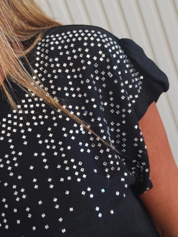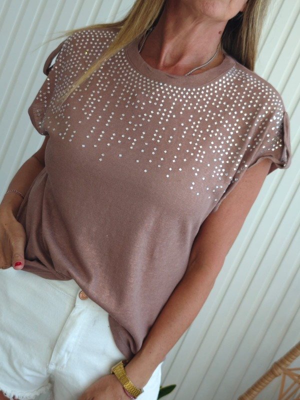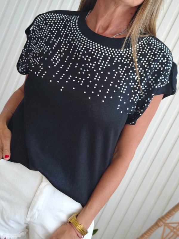 Remera Gala, flame con lurex con detalle stras, abarca hasta L amplio
