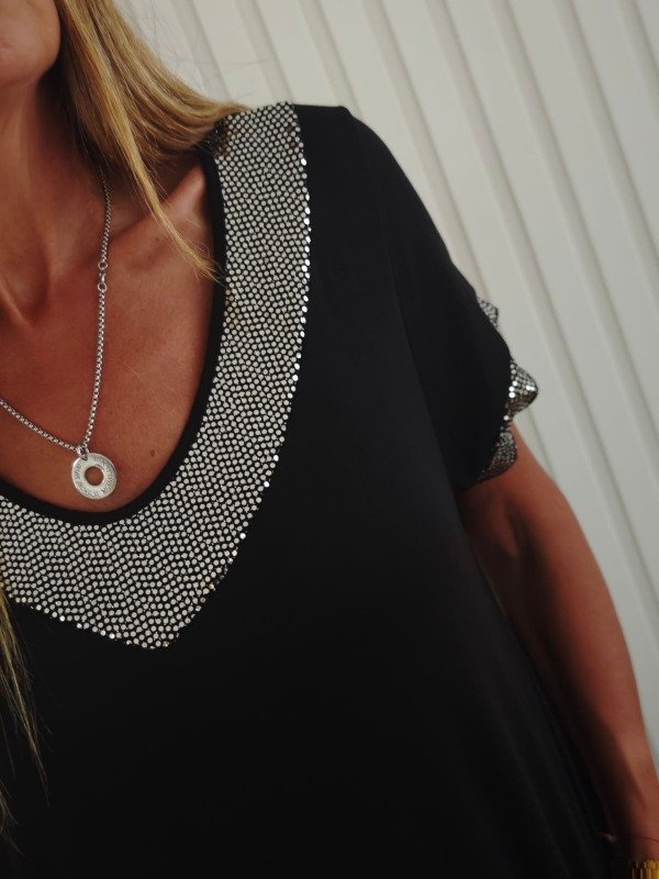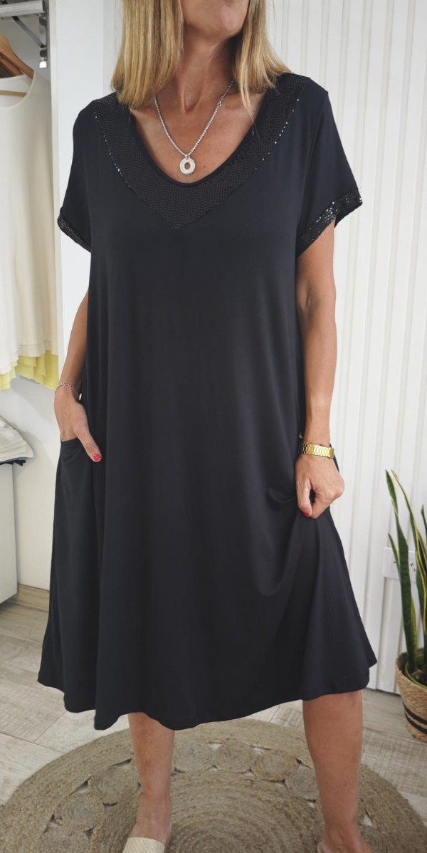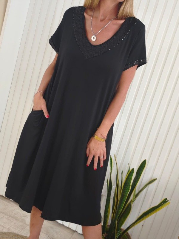 Vestido Camila de creppe viscosa con bolsillo, brillos, y amplio , abarca hasta un XL